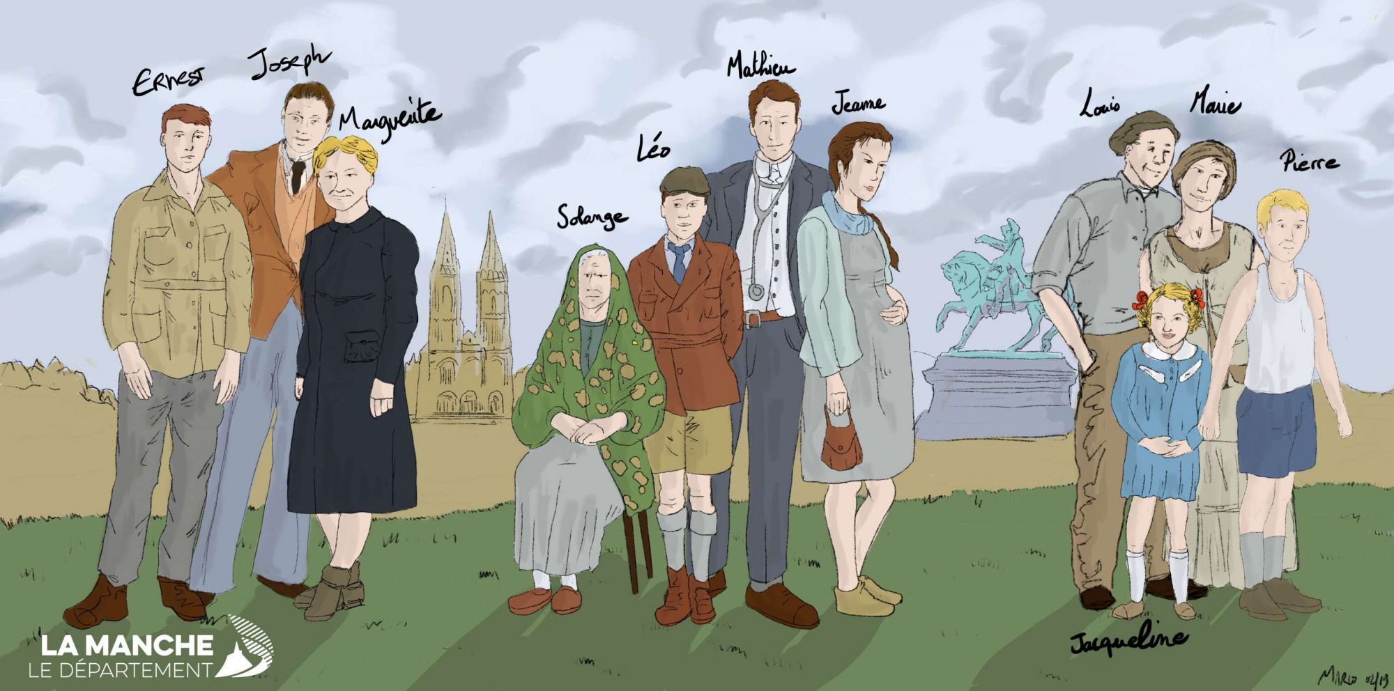 Non, une partie de ma famille vit un peu partout dans la Manche. Il y a ma grand-mère, Solange, la mère de Papa qui vit à Saint-Lô. Son mari est mort à Verdun et je ne l’ai jamais connu. D’ailleurs on en parle peu à la maison. Il y a la sœur de Papa, Marguerite, qui est mariée à Joseph : ils ont eu un fils, Ernest, mon cousin. J’ai une autre tante, Marie, la sœur de Maman, qui exploite une ferme avec mon oncle Louis à Tribehou, pas très loin de Saint-Lô. On est très proches d’eux et j’adore leur rendre visite à la ferme pour jouer dans les champs avec mes cousins Pierre et Jacqueline.