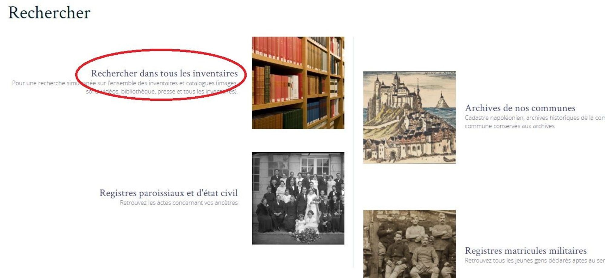 - Rechercher dans tous les inventaires (Pour une recherche simultanée sur l’ensemble des inventaires et catalogues)
