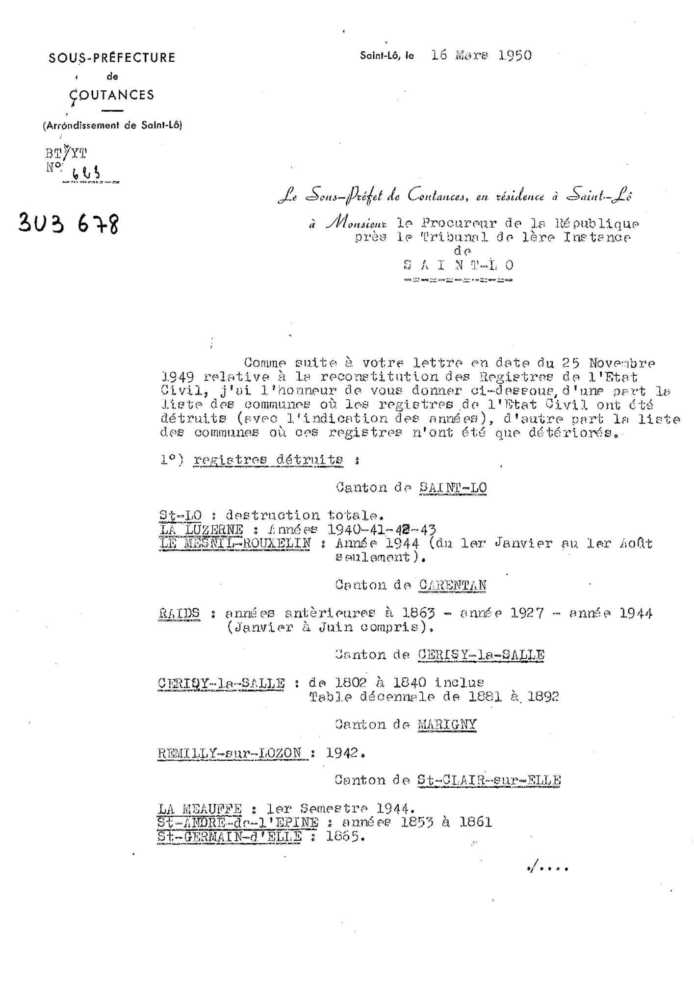 La consultation de l'état civil s'effectue sous format numérique en ligne, sur internet ou en salle de lecture, pour tous les registres antérieurs à 1892. Toutes les collections existantes pour la Manche jusqu’en 1892 ont été microfilmées et mises en ligne sur ce site internet. Si vous ne trouvez pas l'acte que vous recherchez, c'est sans doute que le registre a été perdu avant son arrivée aux archives ou détruit lors des bombardements en 1944.