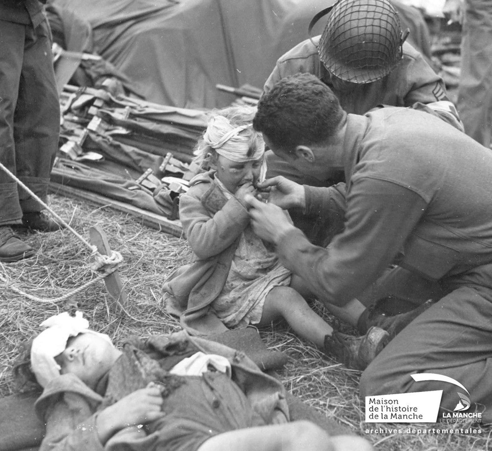 Sur ce cliché, réalisé à Audouville-la-Hubert, le 17 juin 1944, on peut voir une petite fille, Geneviève Marie, blessée lors d’un bombardement près du manoir de Pierreville, dans la soirée du 5 juin. Au premier plan, son frère, Auguste, dort sur une couverture. Les deux enfants auraient perdu leur mère dans le bombardement qui visait probablement une batterie située à la Madeleine, au hameau de La Croix aux Bertots. La photographie a été réalisée dans l’hôpital américain installé, le 6 juin, près de la ferme de La Houssaye.