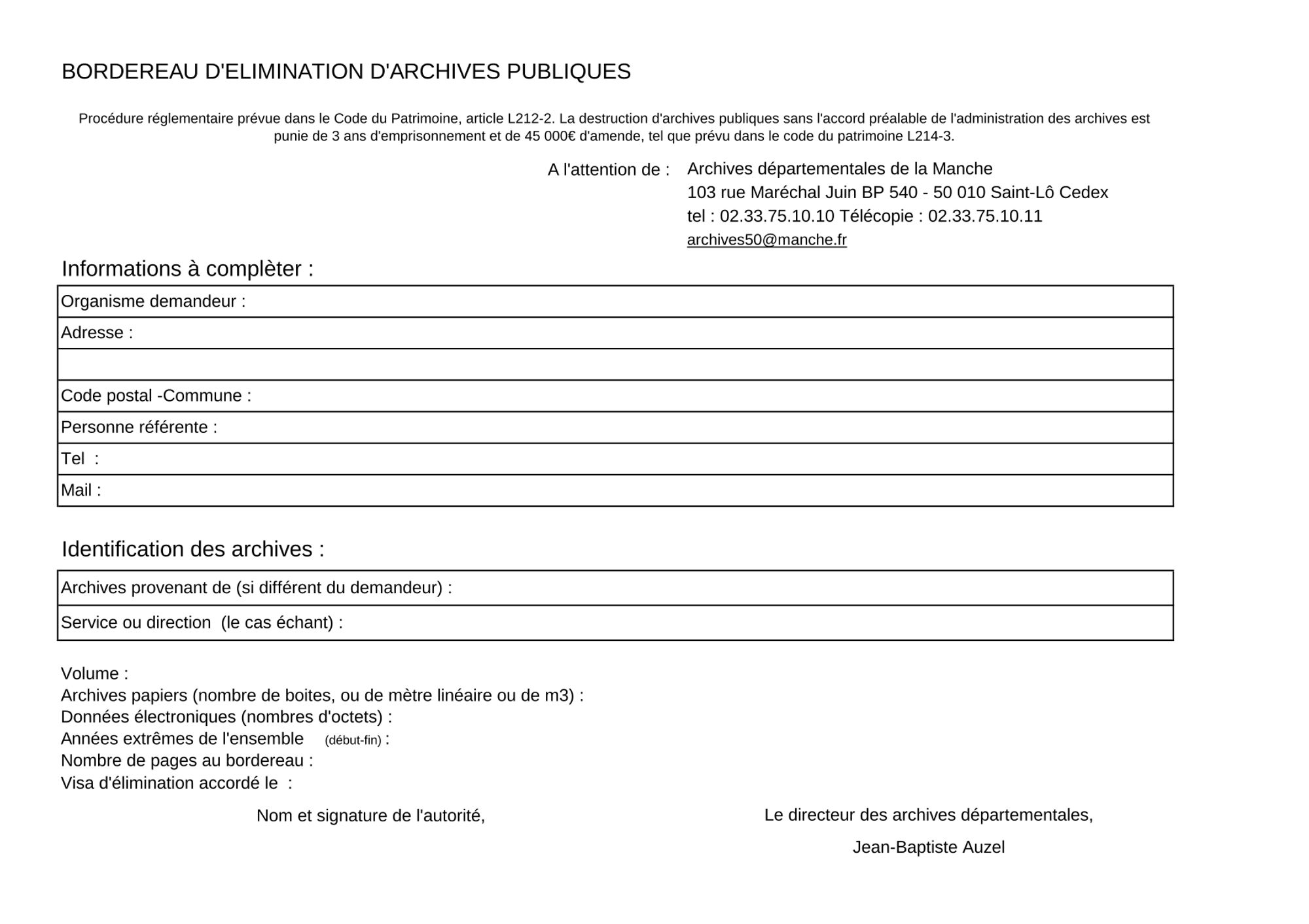 Le directeur des archives départementales de la Manche exerce, pour l’État, un contrôle de la bonne conservation des archives communales (CGCT, R1421-1 et R1421-2).