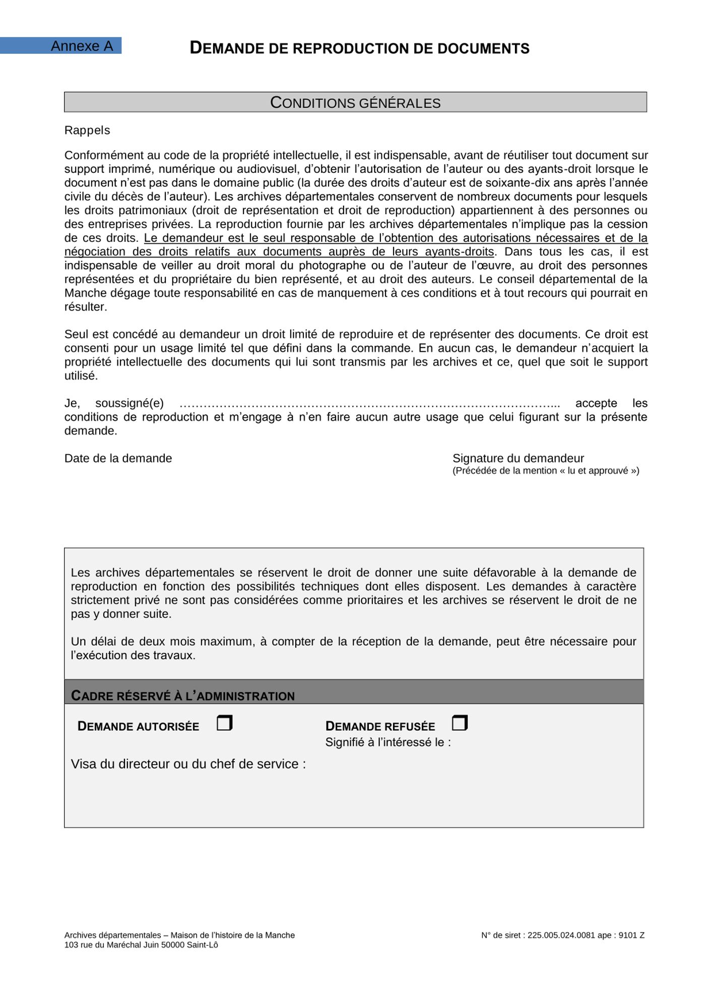 La reproduction n’est pas un droit (circulaire de la direction des archives de France AD 2200/5254 du 4 novembre 1983). Elle est une facilité offerte au public en fonction notamment :